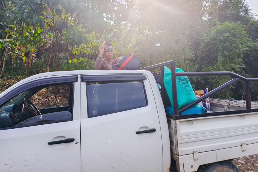 By 8:45 am, we finally started the journey. We had the front seats, while our helpers sat at the back of the pickup along with luggage and food supplies. Their job was not only to travel with us but also to ensure that nothing fell off the vehicle during the bumpy ride.