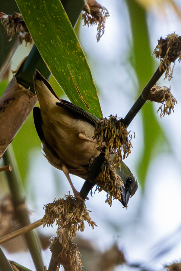 While we were busy photographing them, Binanda quietly announced that our target had arrived. Three Pin-tailed Parrotfinches were feeding on the bamboo. All appeared to be females or sub-adults. The males, which are more colourful, were not present.