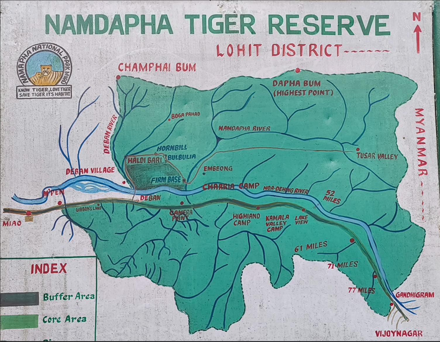Typically, when we visit Namdapha, we stay at Deban Camp, about two hours from Miao. However, the Parrotfinches were being seen near Gandhigram, close to the far end of the forest and not far from the Myanmar border. The distance from Deban to Gandhigram is roughly 120 km.